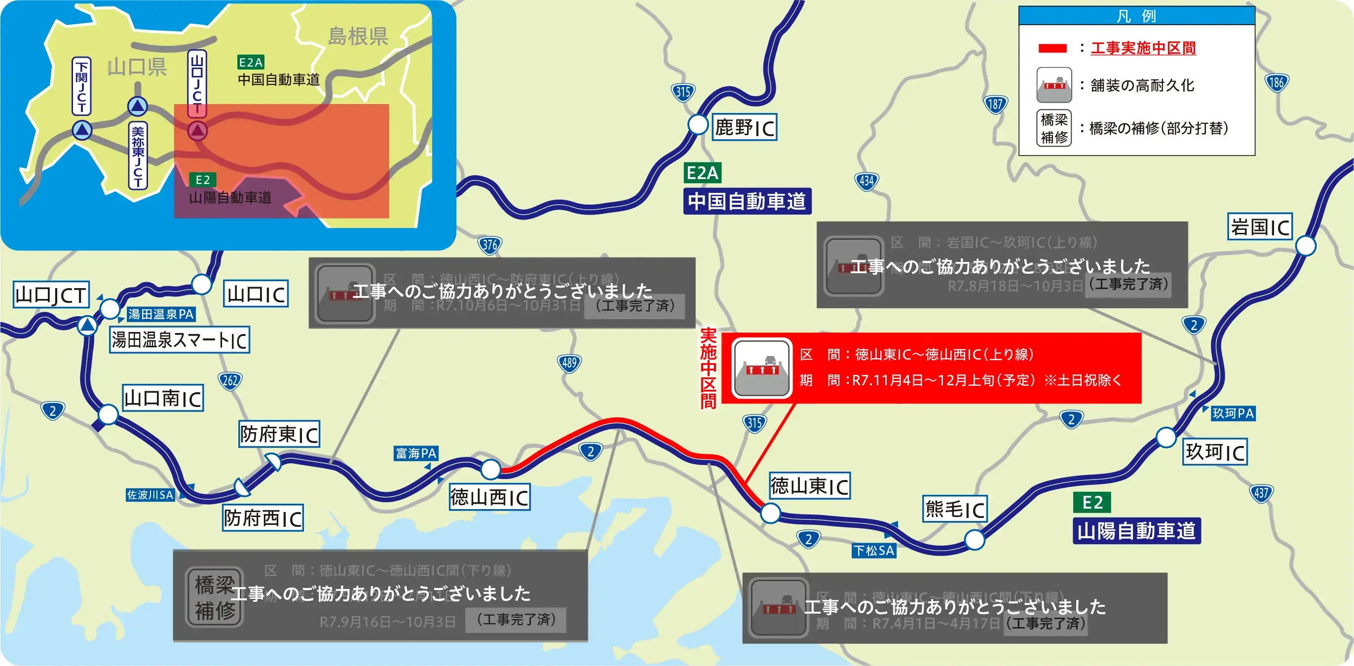 | 区間 | 徳山西IC 〜 防府東IC | 徳山東IC 〜 徳山西IC | 熊毛IC 〜 徳山東IC | 玖珂IC 〜 熊毛IC | 岩国IC 〜 玖珂IC | ||